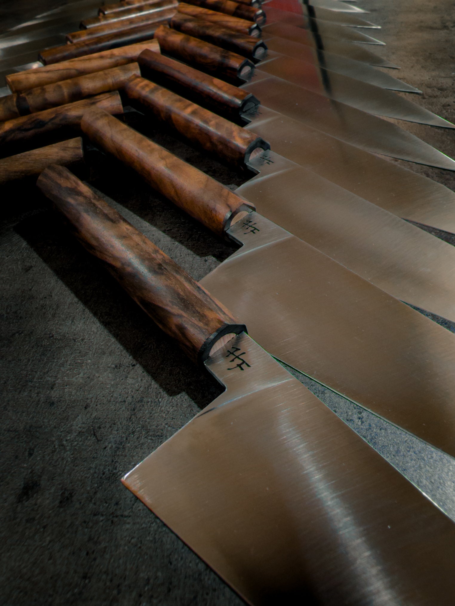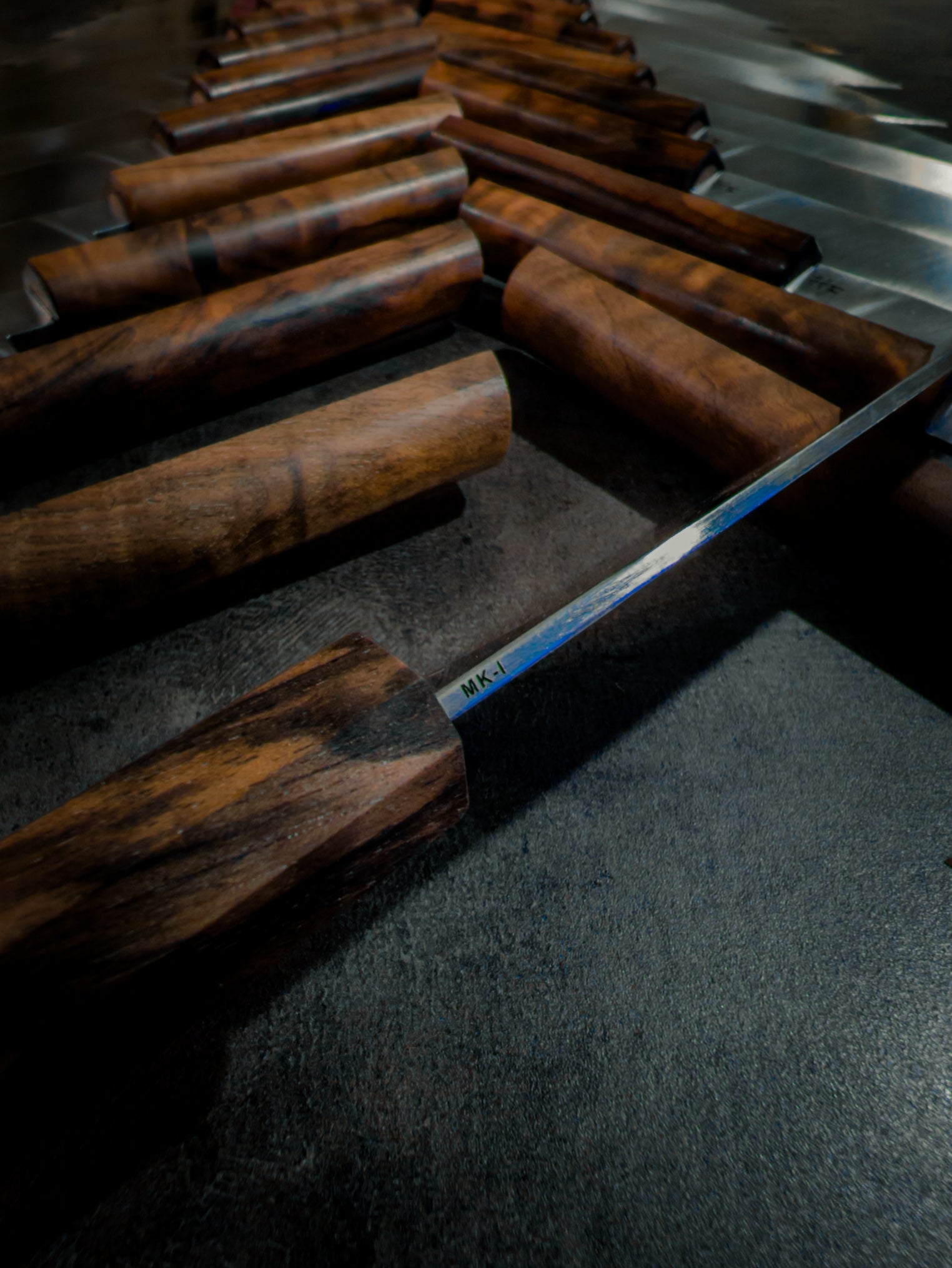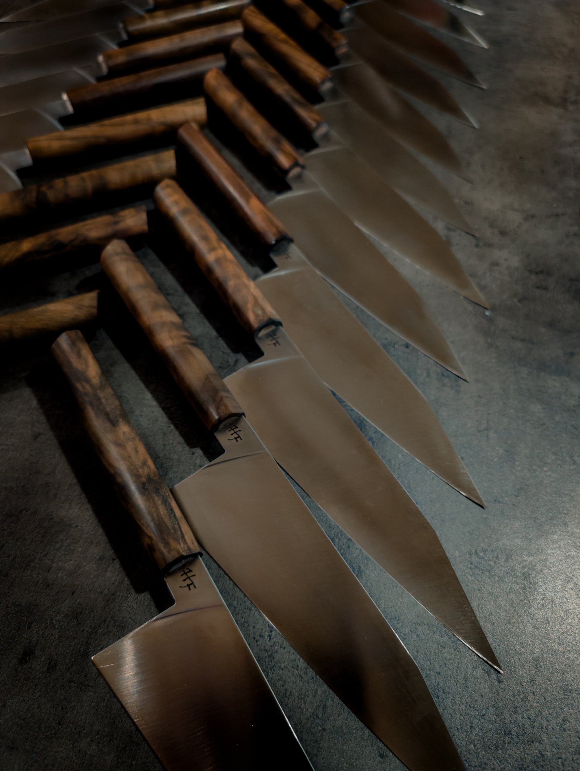The handle is formed from stabilised Turkish walnut, shaped to a clean 20×20mm profile and finished at 150mm long. It's unique shape is my take on the traditional japanese WA style handle. With faceted edge at the top and a round belly, it sits beautifully in the hand while also giving a striking aesthetic. Natural grain, subtle figuring, and a refined silhouette give each knife a distinct character while maintaining consistency across the series.